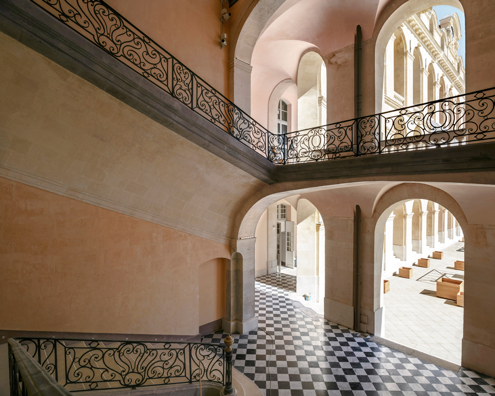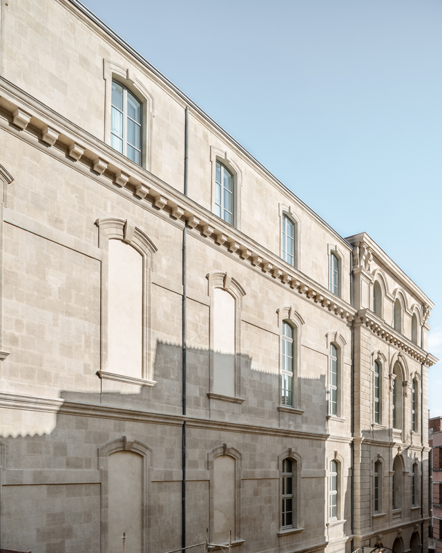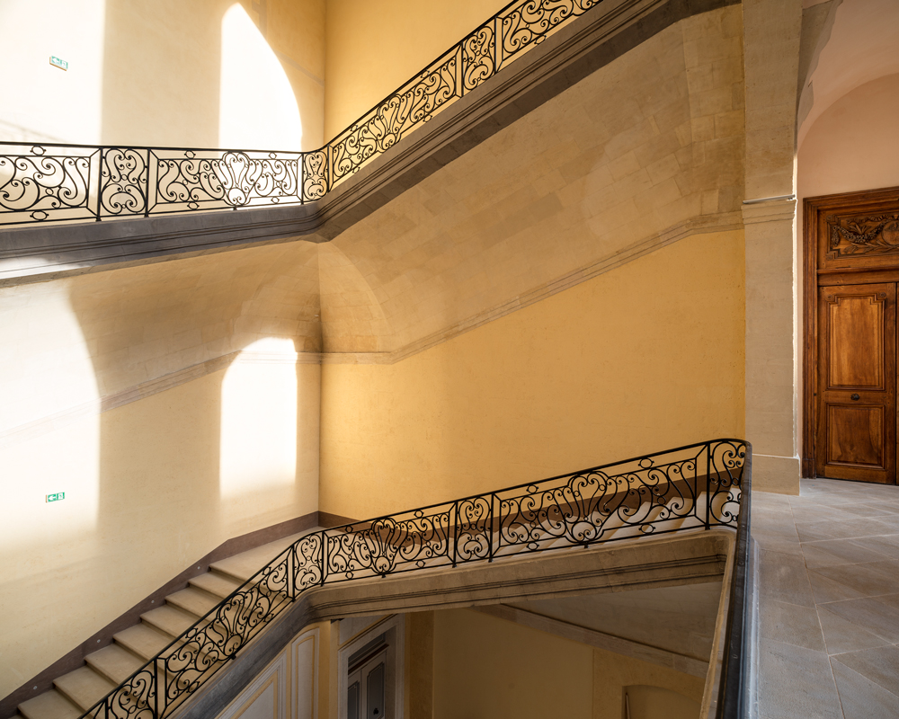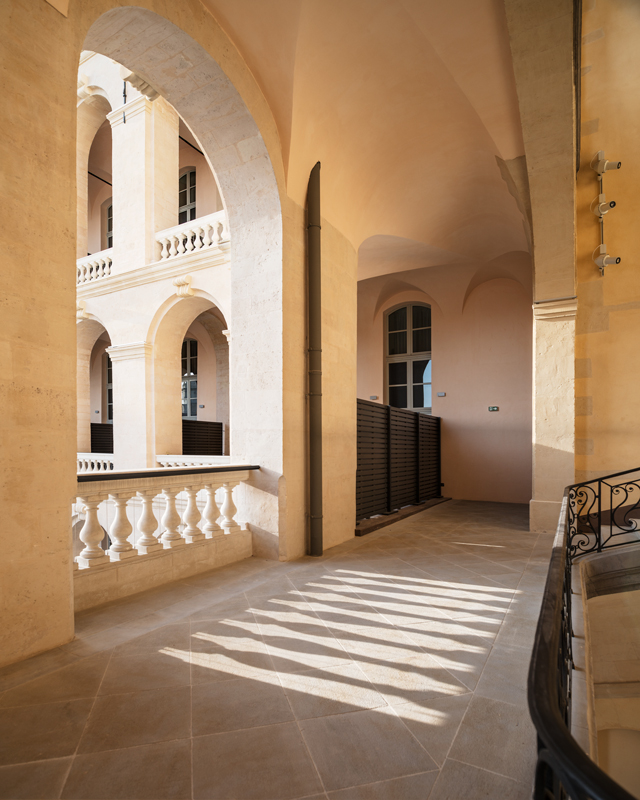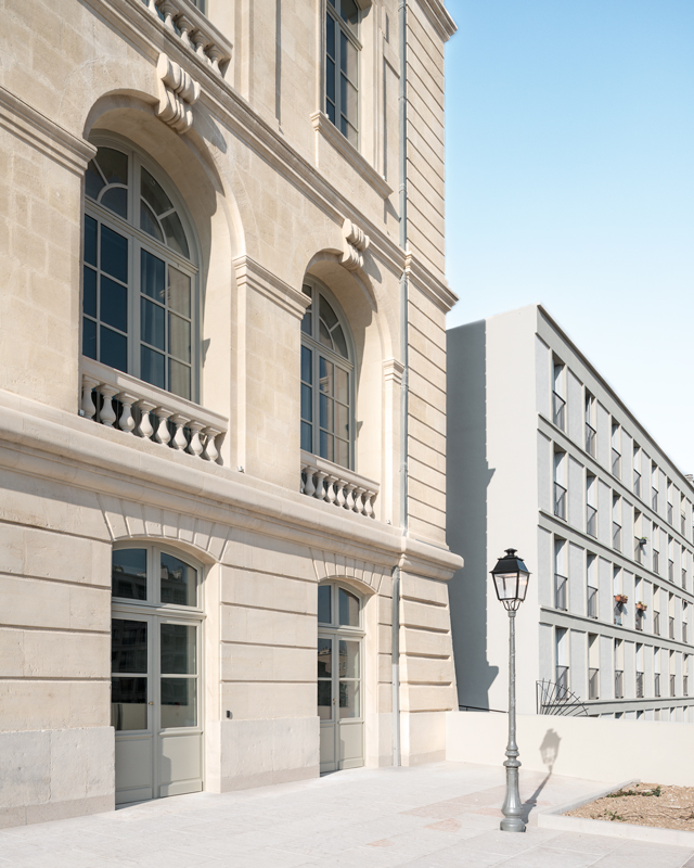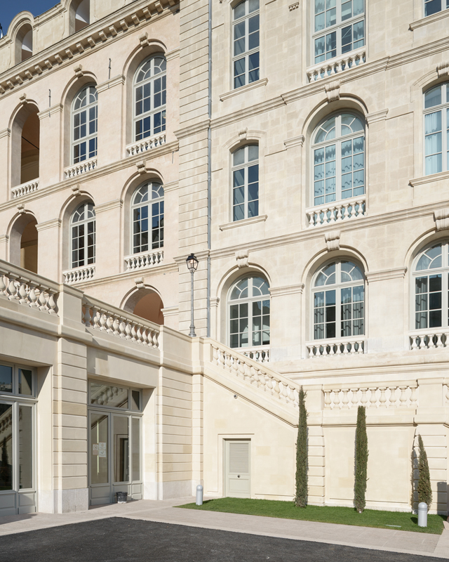| Le bâtiment, respecté et dépouillé de ses ajouts successifs, déploie en regardant la mer sa façade lumineuse à la symétrie militaire, flanquée de deux ailes sur quatre niveaux.
